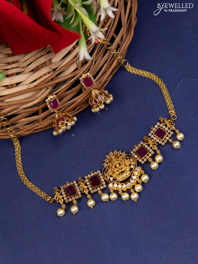 Antique choker lakshmi design with pink kemp & cz stones and pearl hangings without earrings