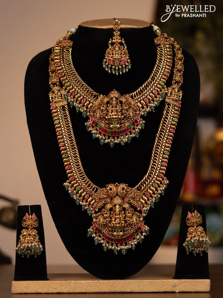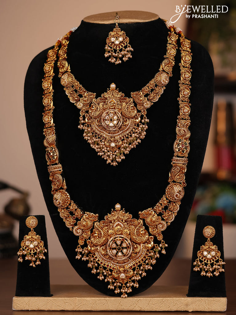 Antique combo set lakshmi design with kemp & cz stones and pearl hangings