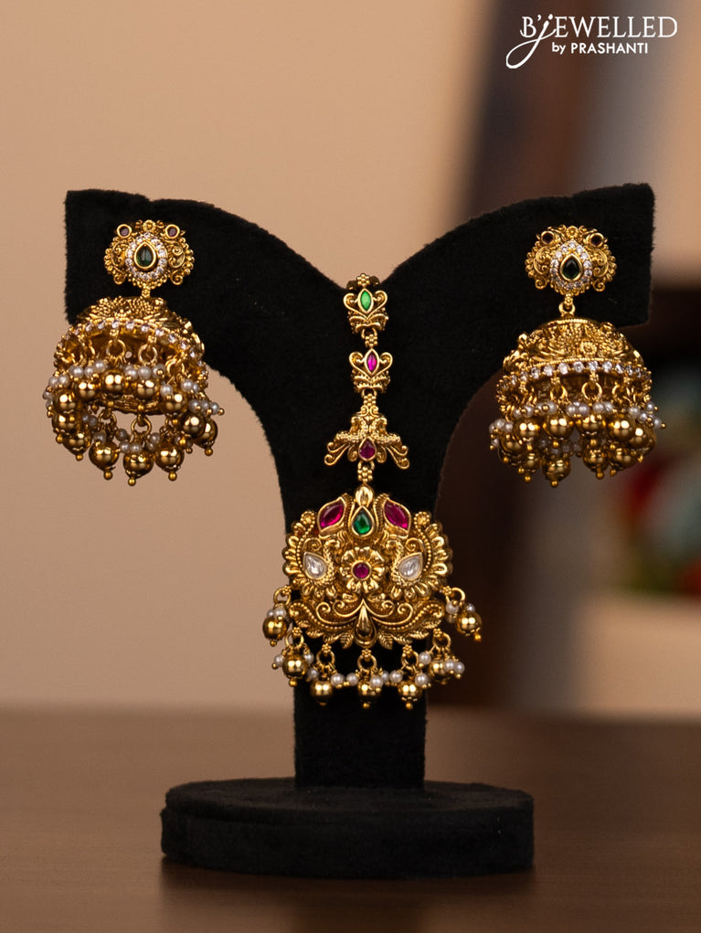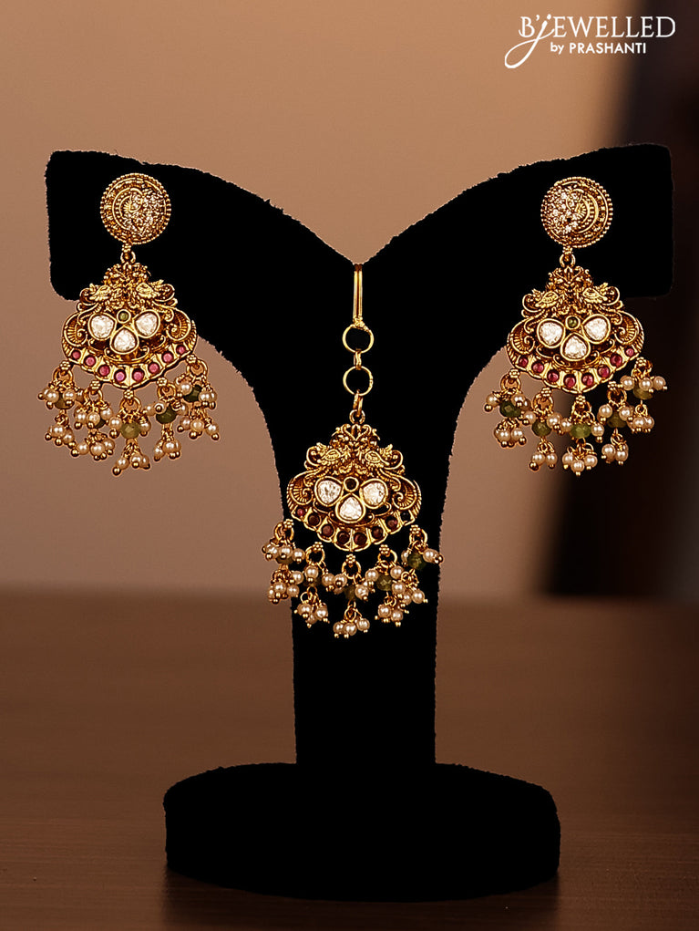 Antique combo set peacock design with jadau kundan stones and pearl & green beads hanging