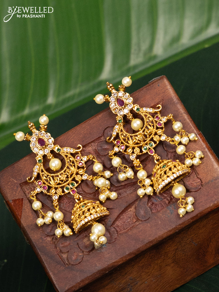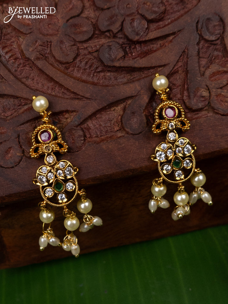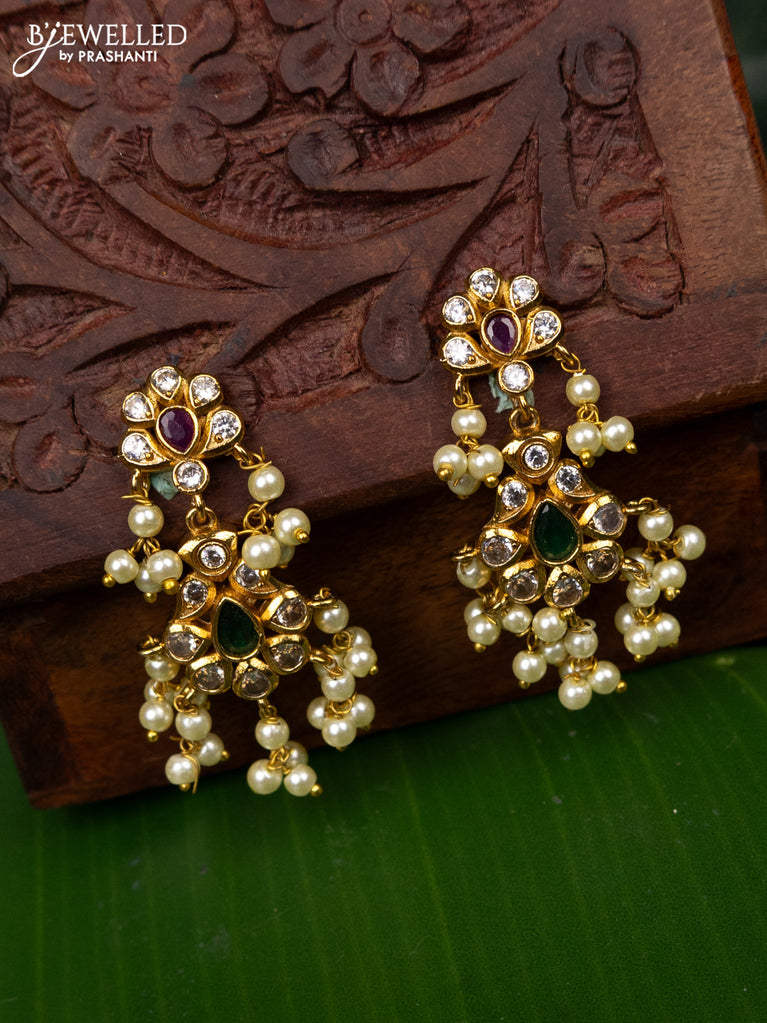 Antique earring peacock design with kemp & cz stones and pearl hanging
