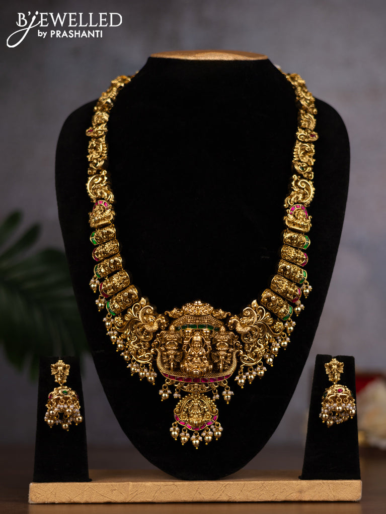 Antique haaram lakshmi design with kemp and cz stones and pearl hangings