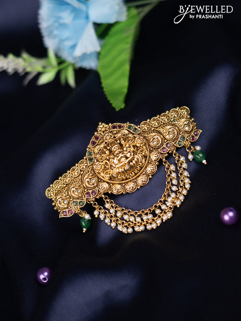 Antique hair clip medium size lakshmi design with kemp stones and pearl hangings