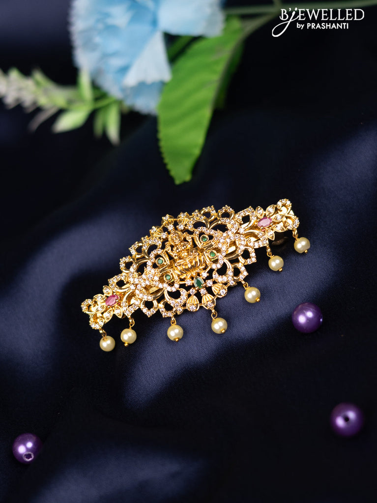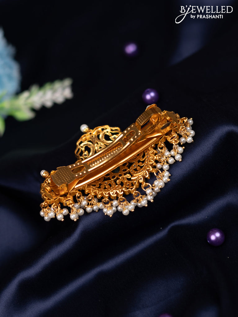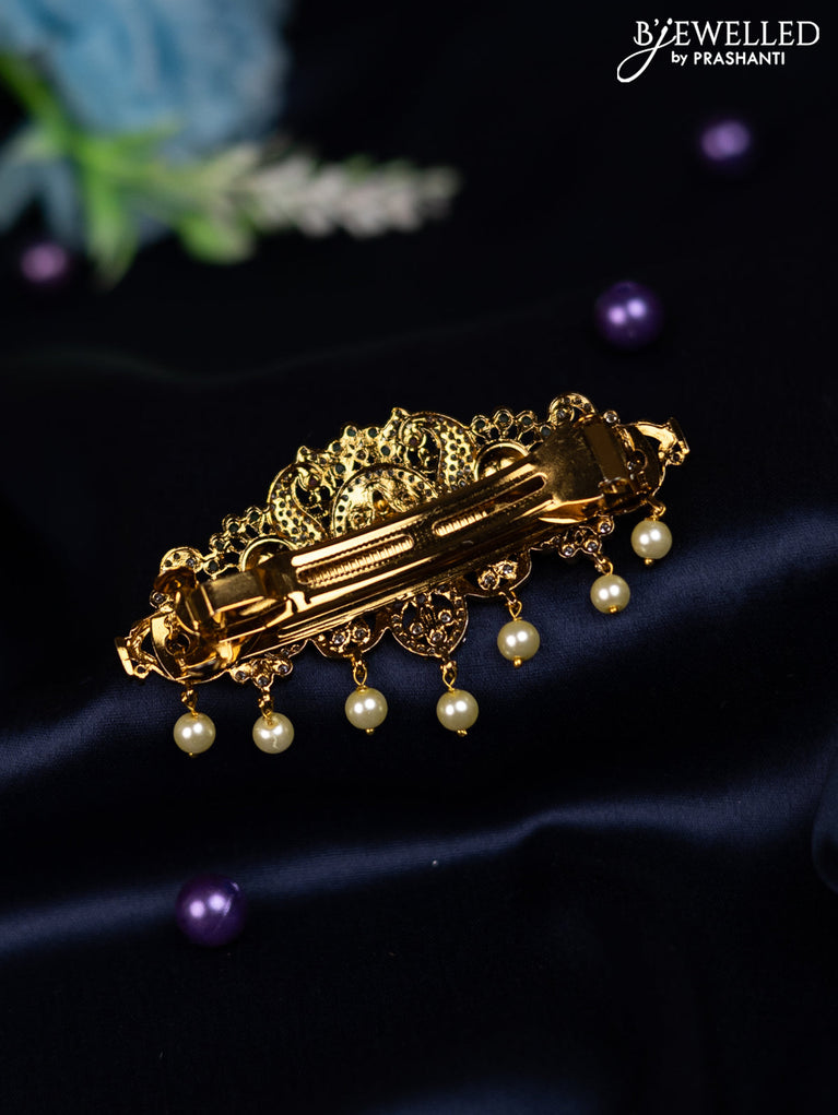 Antique hair clip medium size peacock & lakshmi design with kemp & cz stones and pearl hangings