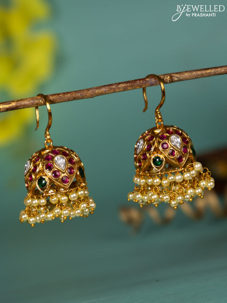 Antique hanging type jhumka with kemp & kundan stones and pearl hangings