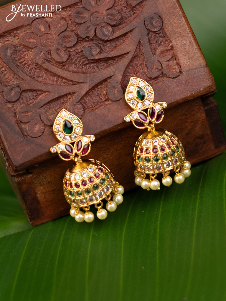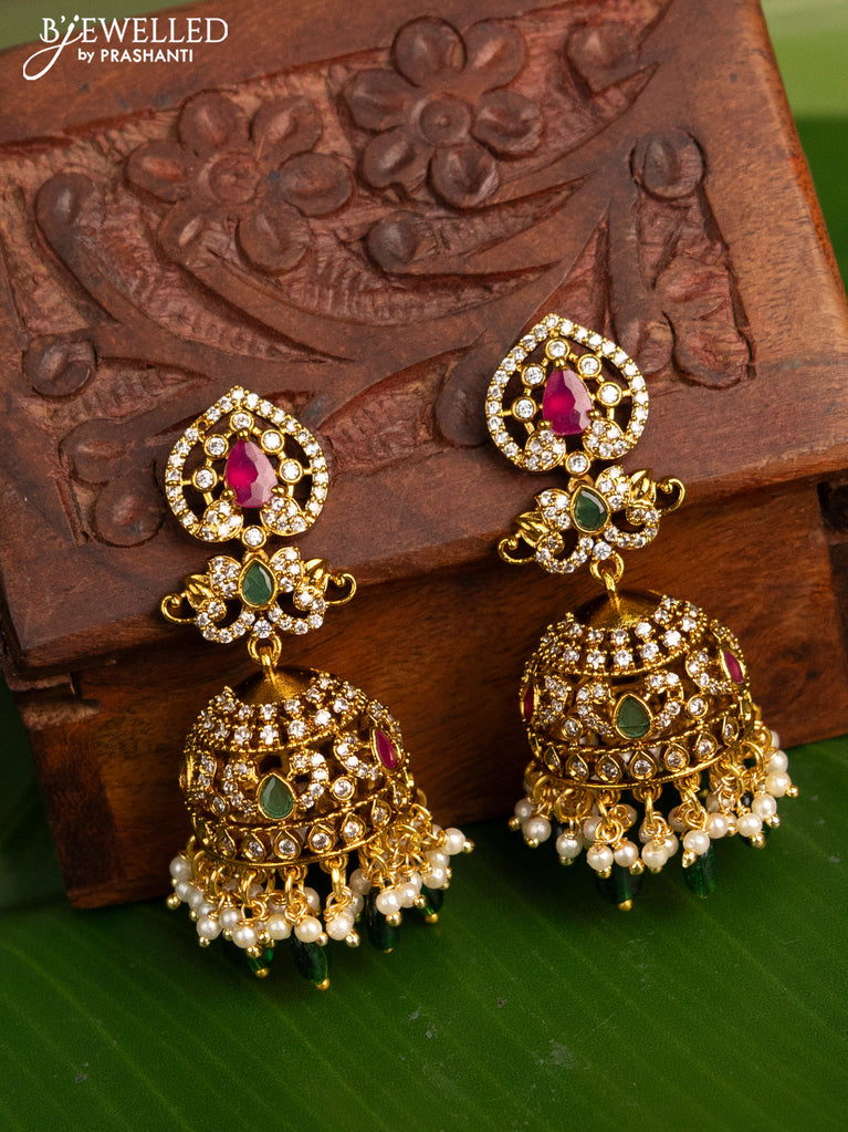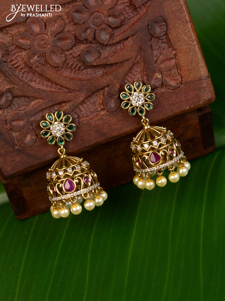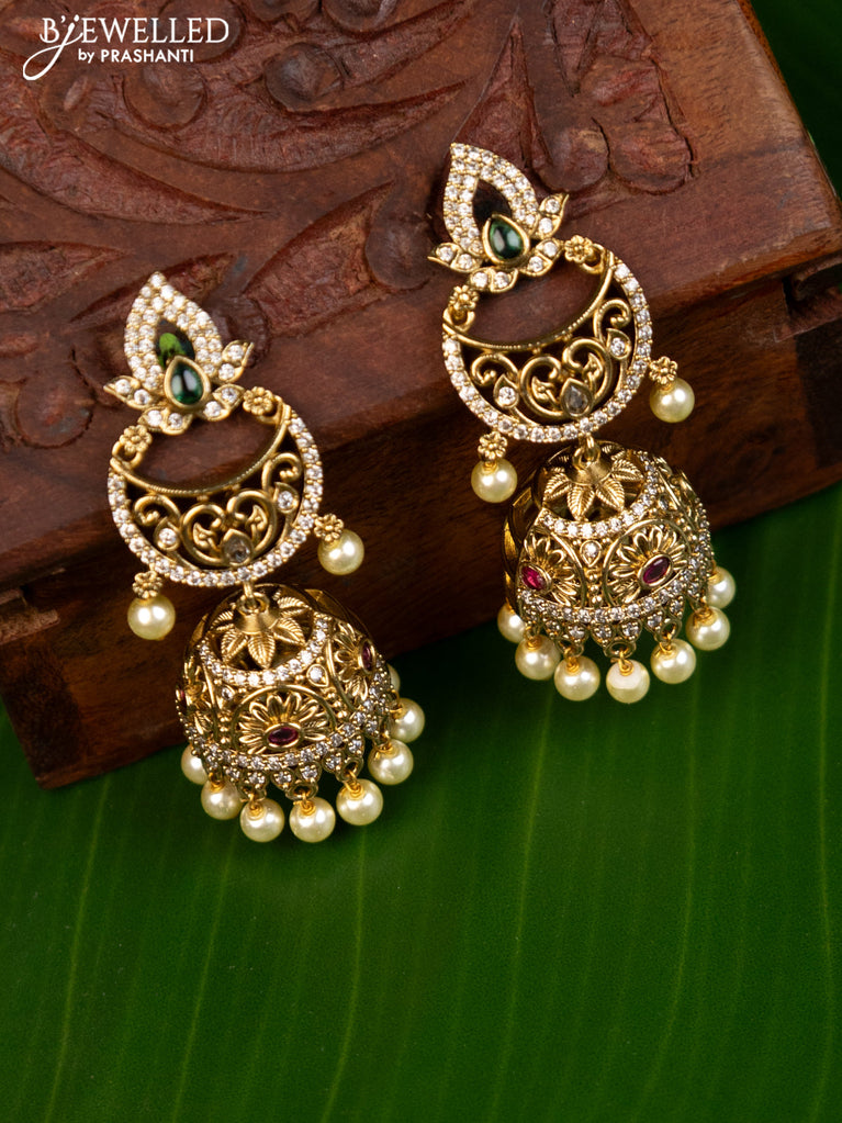 Antique jhumka with kemp & cz stones and pearl & green beads hanging