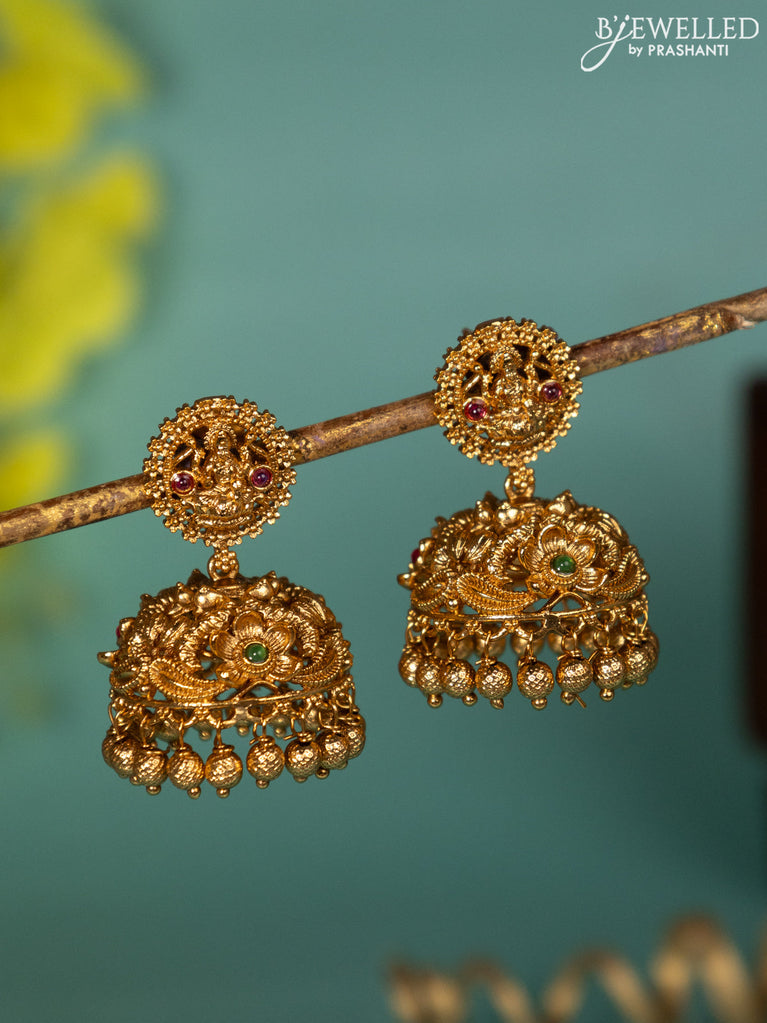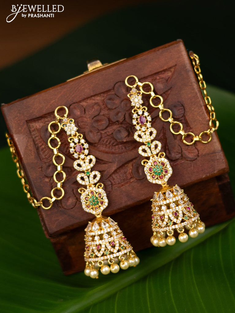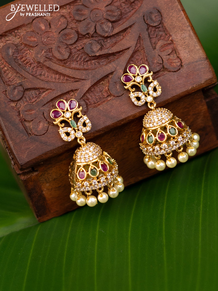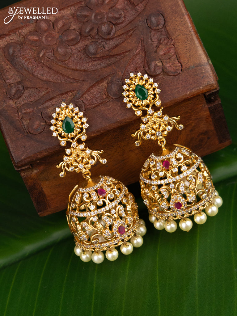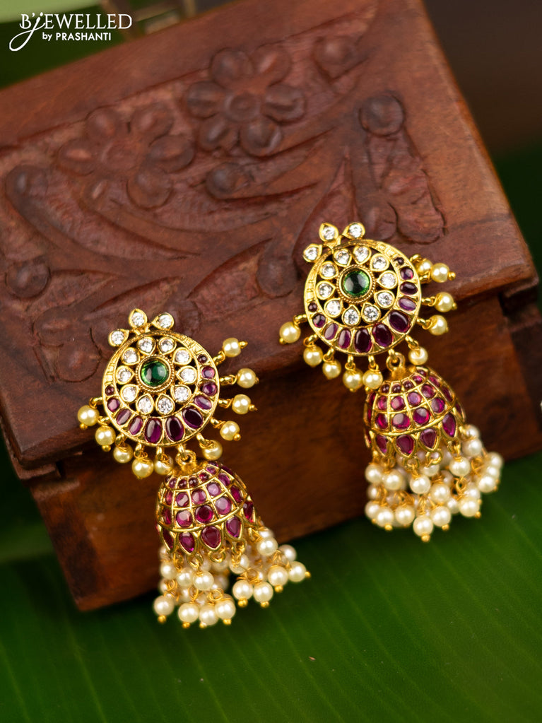 Antique jhumka with kemp & cz stones and pearl & green beads hanging