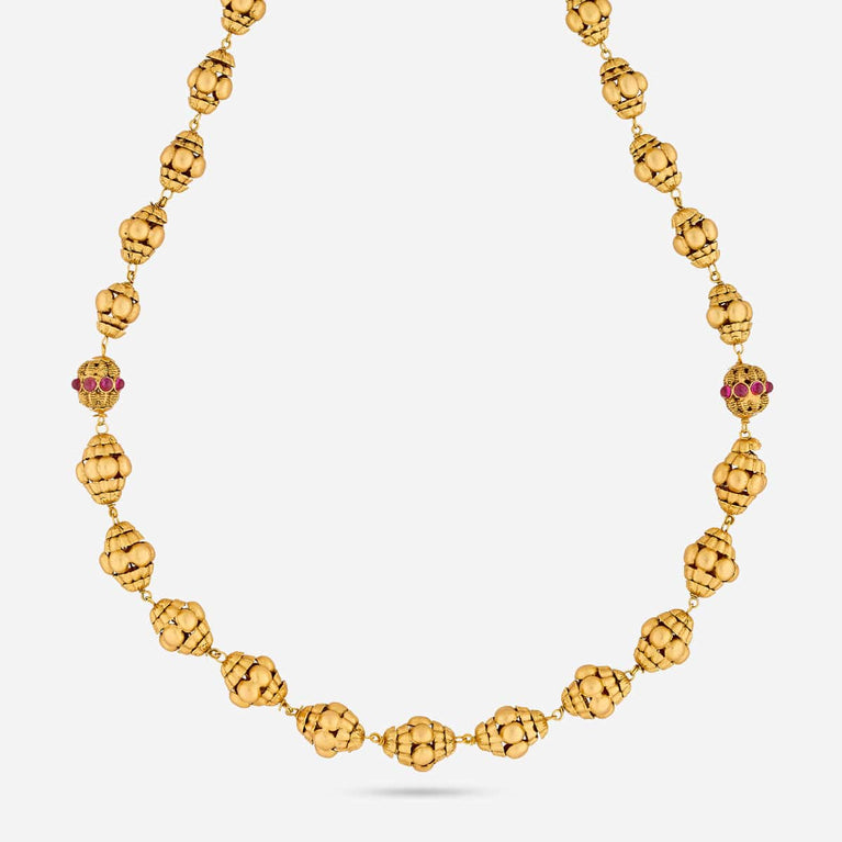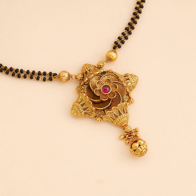 Kushal's Fashion Jewellery Flower Motif Antique MangalsutraIf you want to avoid the hassle of pairing your favourite Mangalsutra with earrings, allow our latest set of antique Mangalsutra and matching earrings to handle it for you. Thanks to its studded ruby stones with gold polish, this mangalsutra set with marvellous earrings will be your perfect partner for all events.