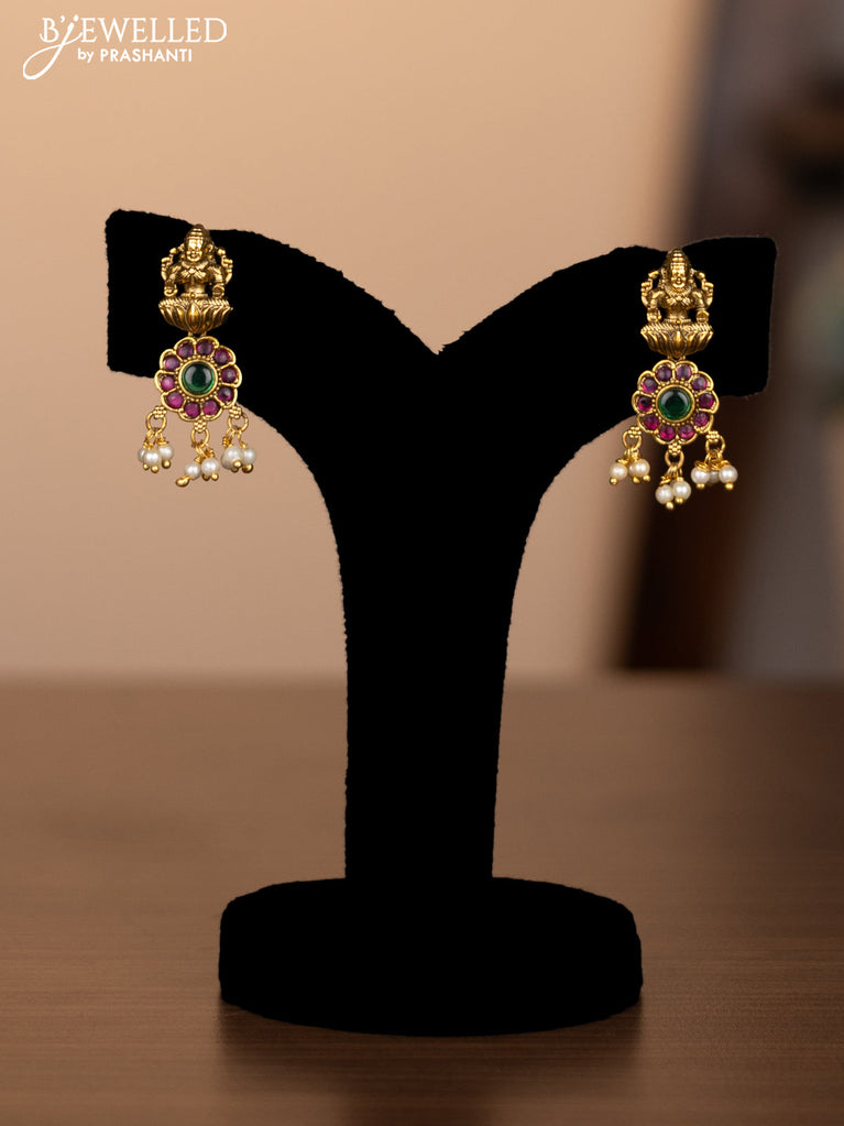 Antique necklace lakshmi design with kemp & cz stones and pearl & golden beads hanging