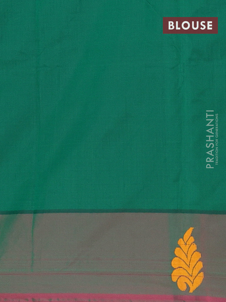 Arani semi silk saree pista green and dual shade of pink with plain body and temple design border