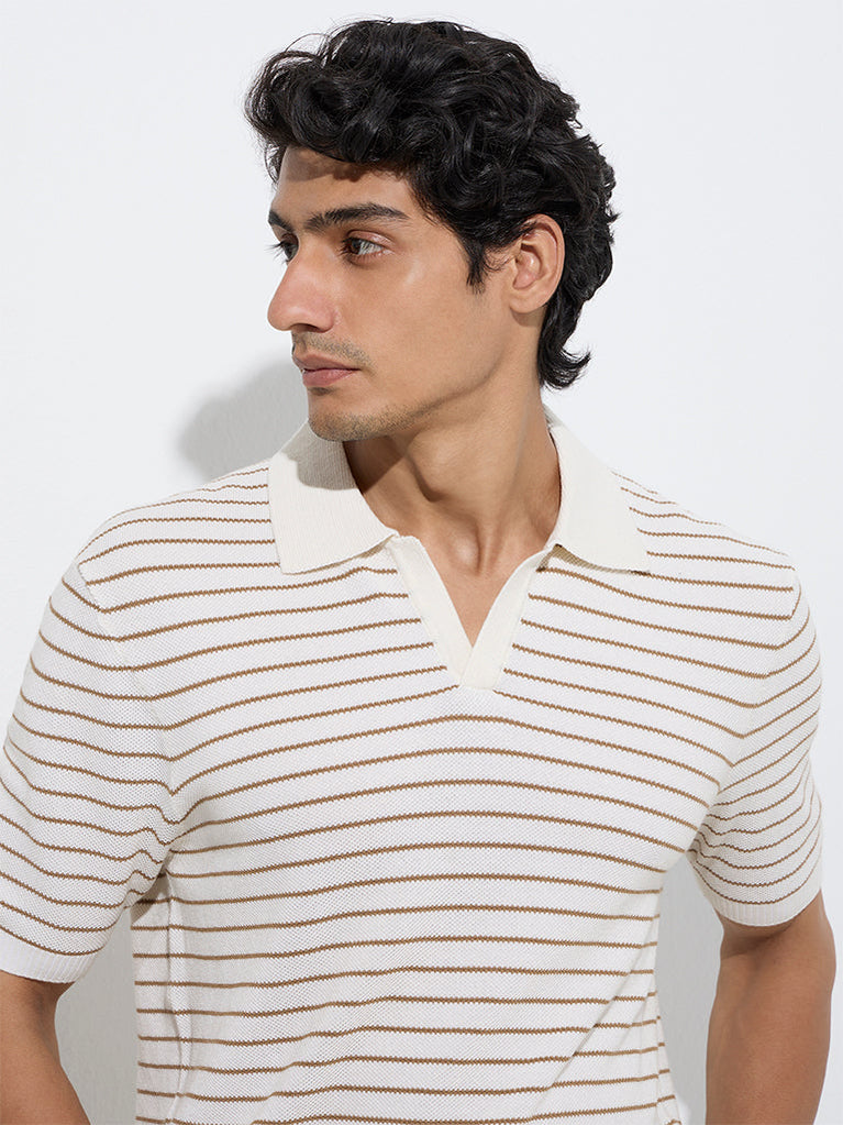 Ascot Taupe Stripe Relaxed-Fit Cotton-Blend Polo T-Shirt