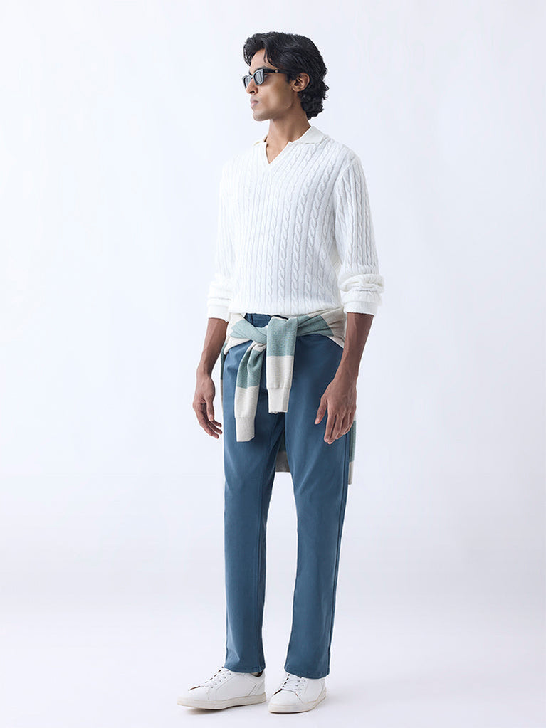 This teal sweater by Ascot exhibits cable-knit texture on a premium-blend construction. Framed in a relaxed-fit profile, it carries a polo neck and full sleeves. This easy design is suitable for elevating your smart-casual wardrobe.