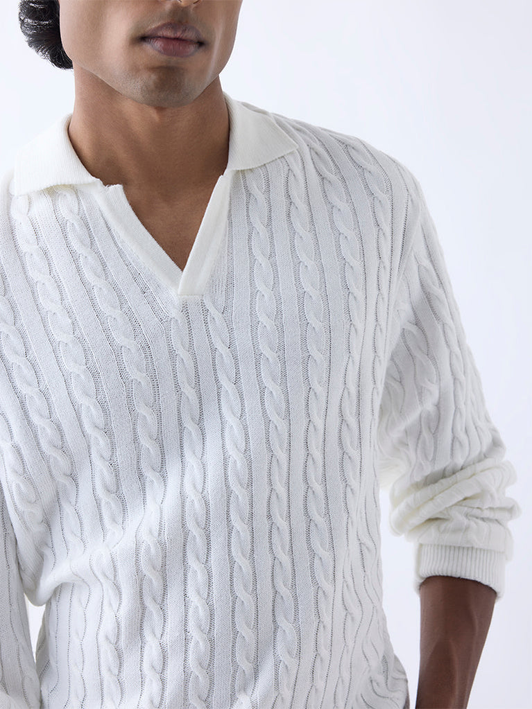 Ascot introduces this white sweater built in a relaxed frame from luxurious-blend fabric. Showcasing a cable-knit texture, it is framed with a polo neck and full sleeves, making it an easy essential for refined casual wear.