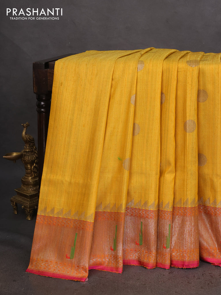 Banarasi handloom dupion silk saree mustard yellow and pink with woven coin buttas and zari woven muniya butta border