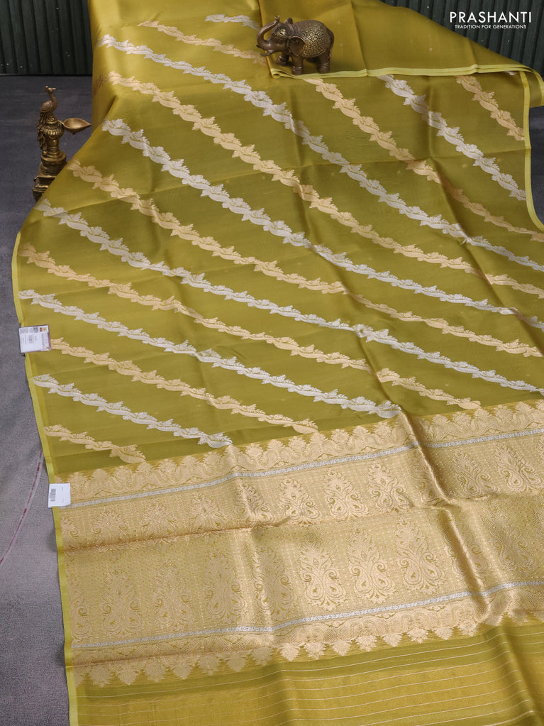 Banarasi organza silk saree mustard green with silver & gold zari weaves and piping border