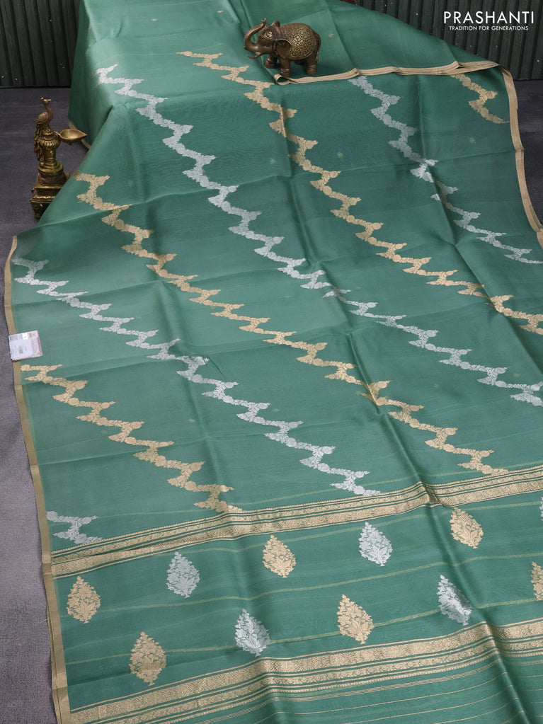 Banarasi organza silk saree teal green shade with silver & gold zari weaves and zari woven piping boder