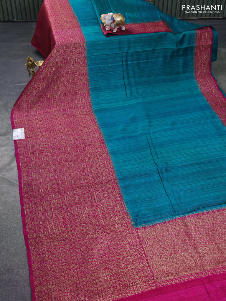 Banarasi raw silk saree teal bluish green and pink with plain body and long zari woven border