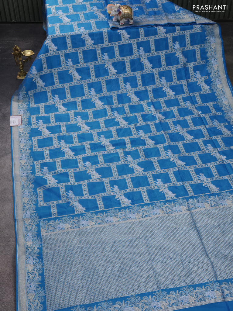 Banarasi semi katan silk saree cs blue with allover silver & gold zari weaves and zari woven border