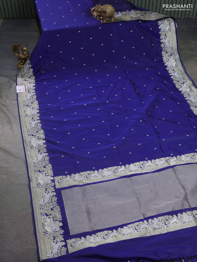 Banarasi semi katan silk saree dark blue with allover silver & gold zari weaves and deer design zari woven border