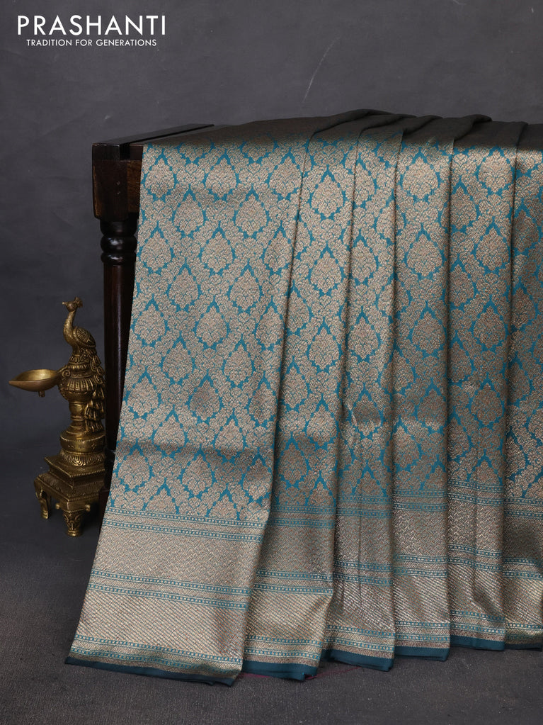 Banarasi semi katan saree teal blue with lion zari woven buttas and rich zari woven butta border