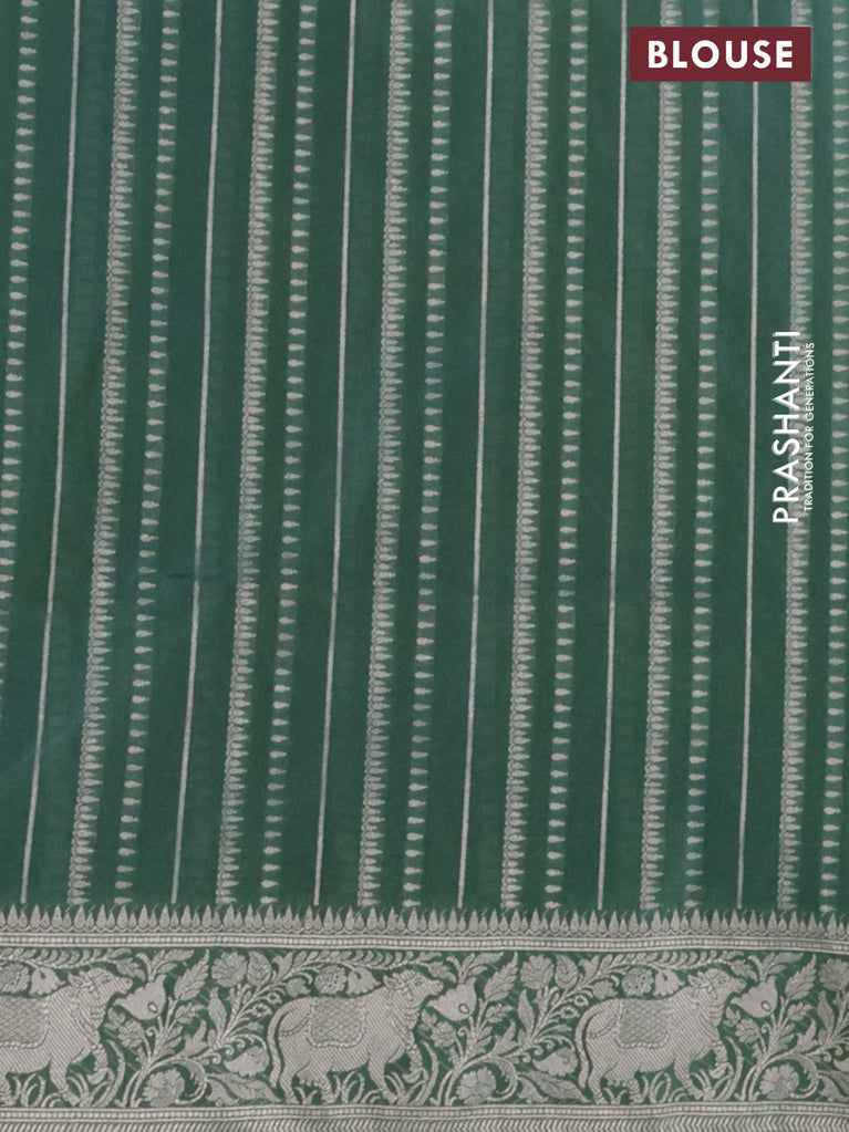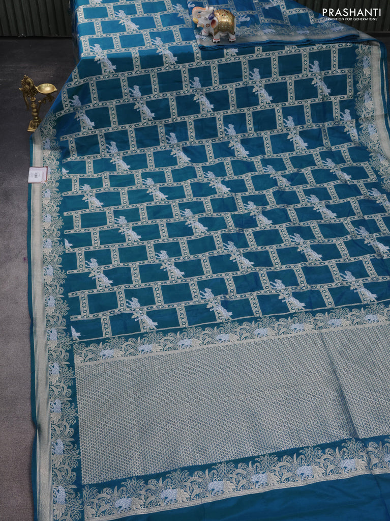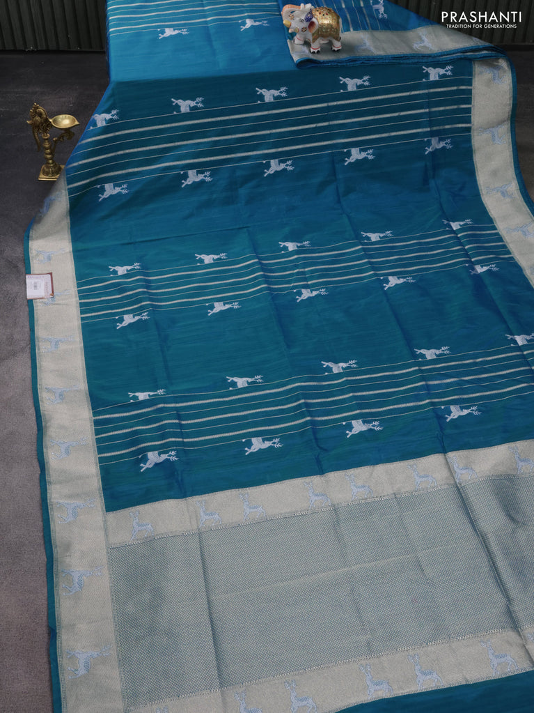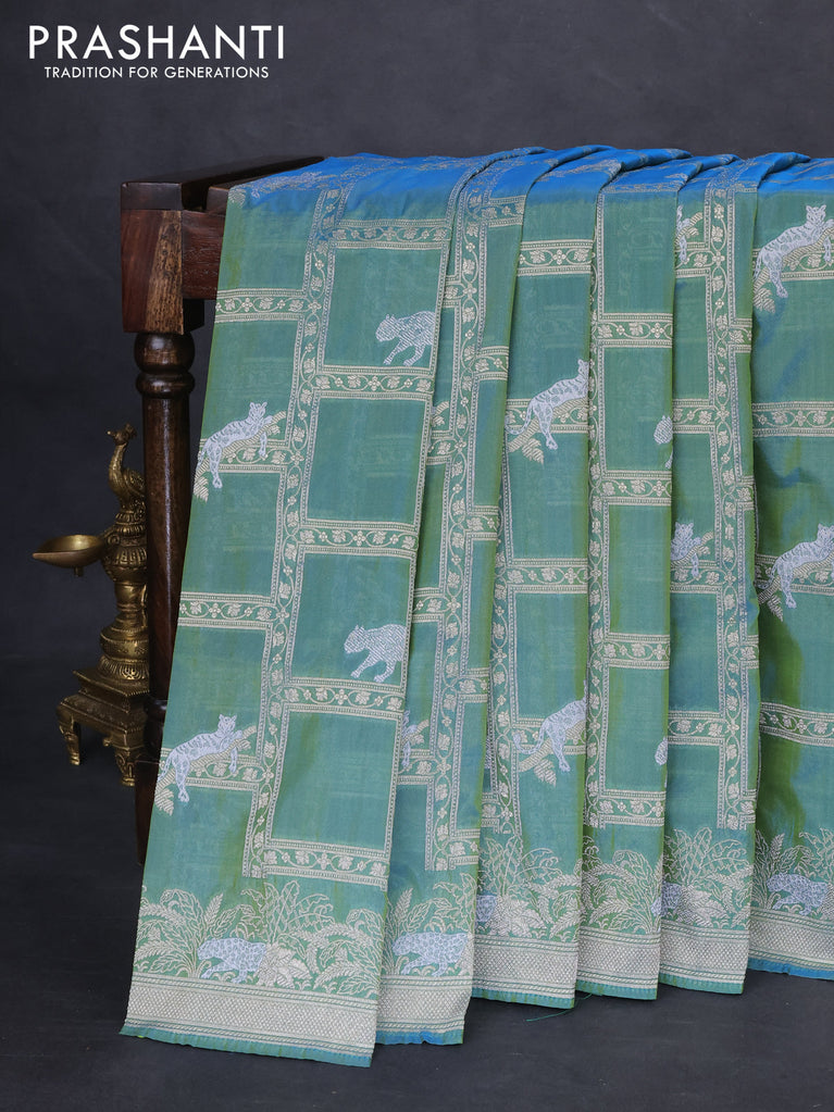 Banarasi semi katan silk saree dual shade of teal bluish green with allover silver & gold zari weaves and deer design zari woven border