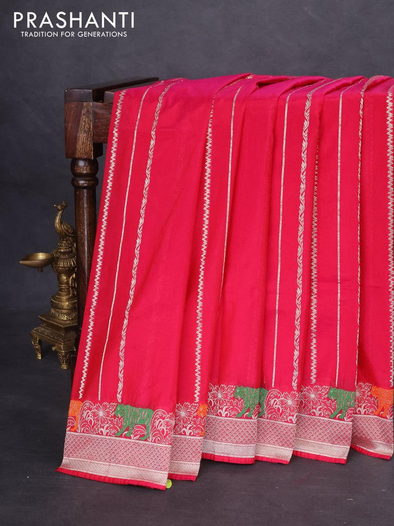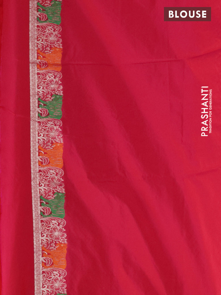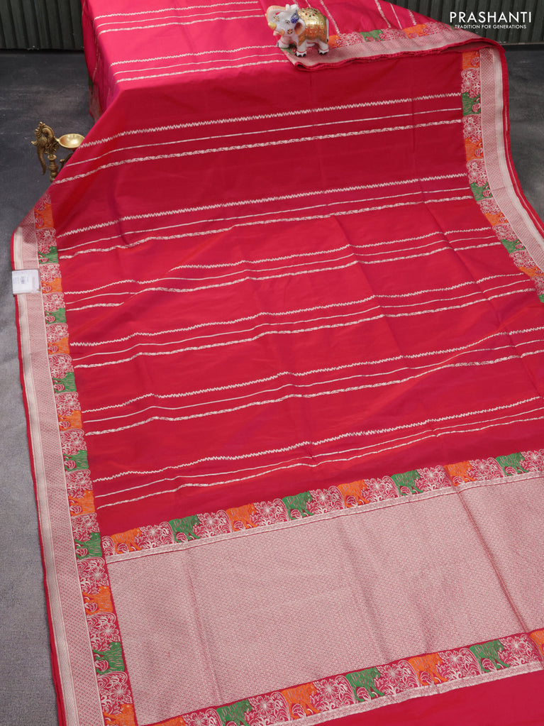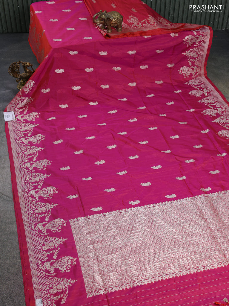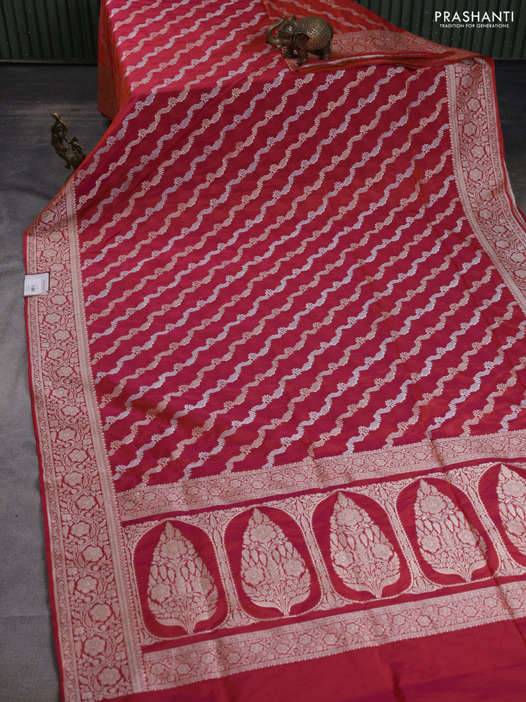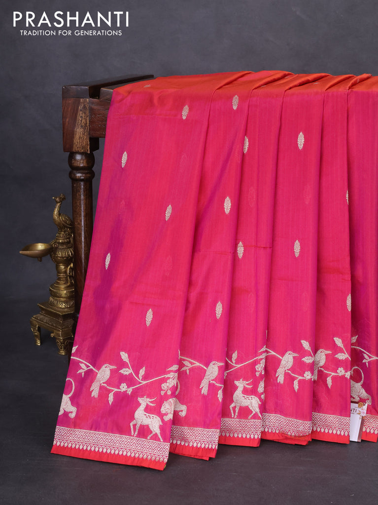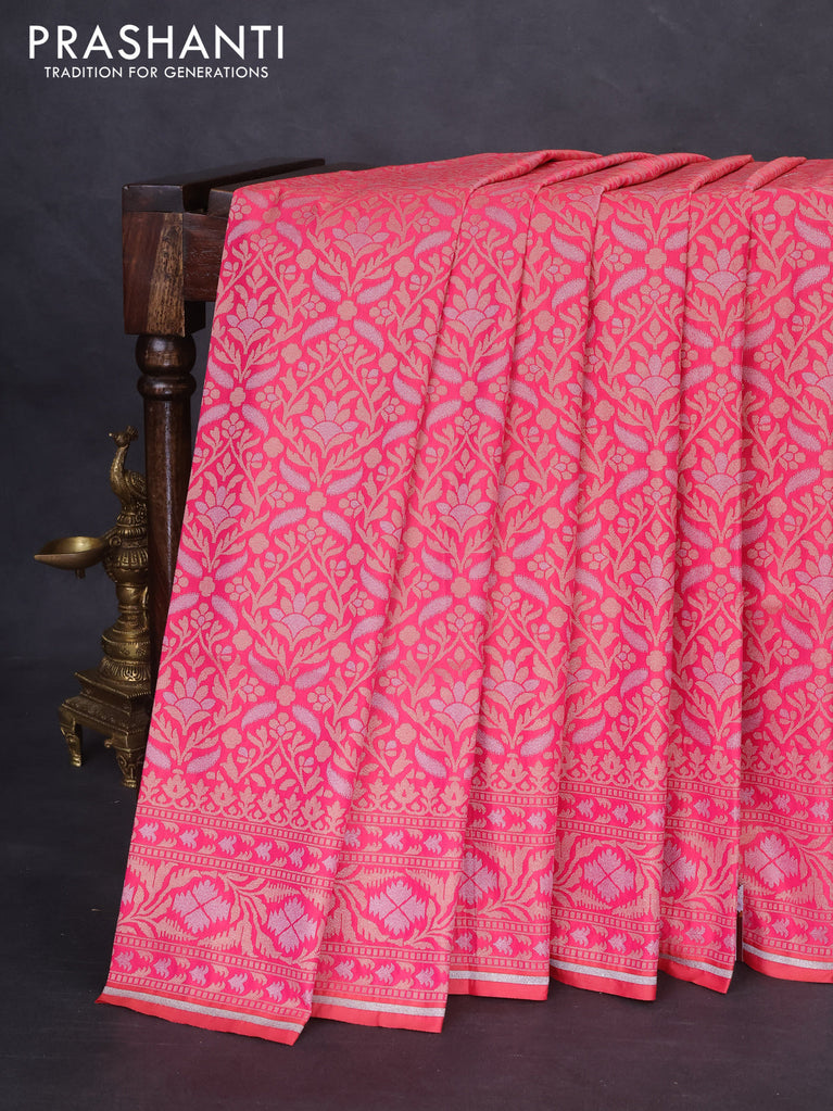 Banarasi semi katan silk saree dual shade of magenta pinkish orange with allover silver & gold zari weaves and floral zari woven border