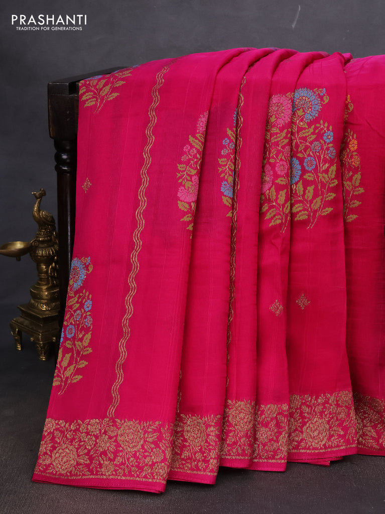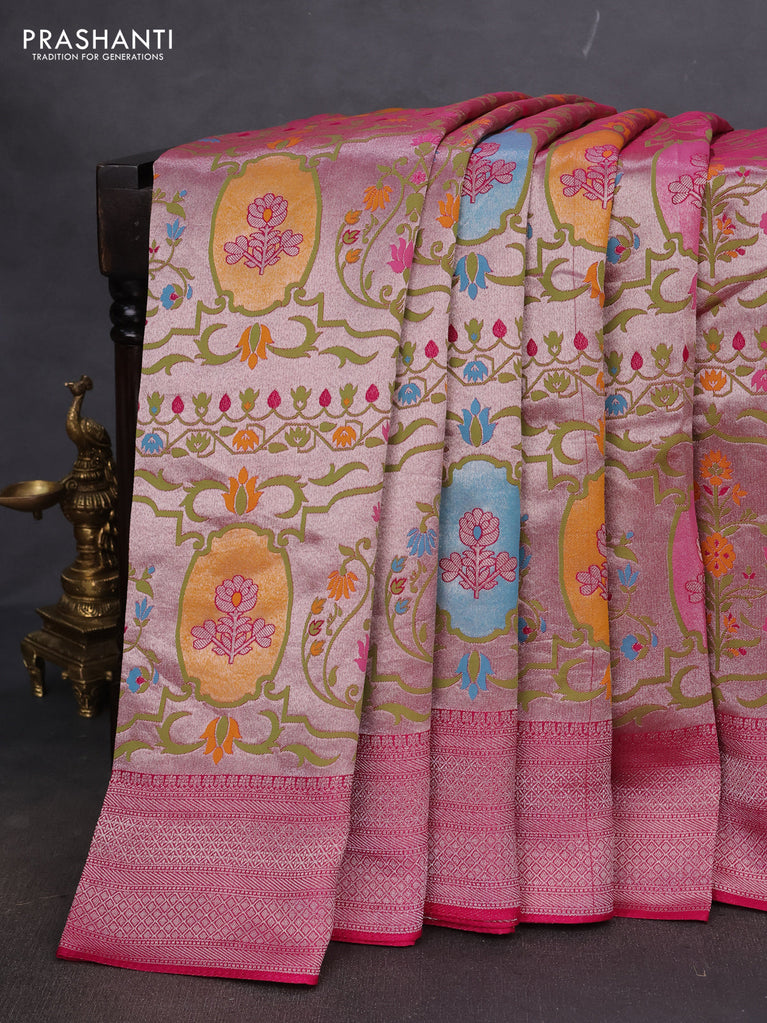 Banarasi semi raw silk saree pink with allover silver zari woven floral weaves and floral design paithani border