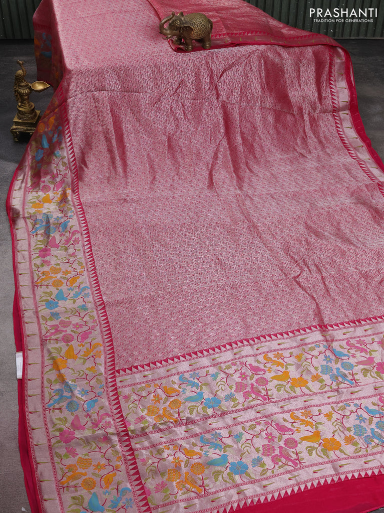 Banarasi semi raw silk saree pink with allover silver zari woven paithani weaves and woven border