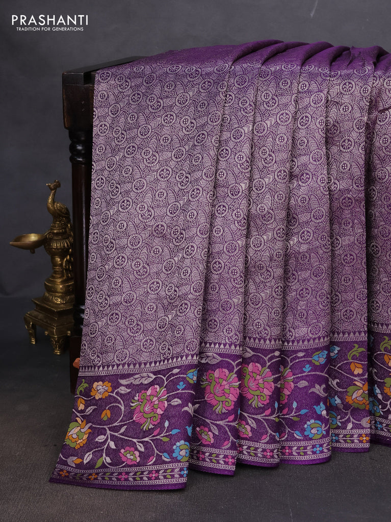 Banarasi semi raw silk saree purple with allover zari woven brocade weaves and floral design paithani border
