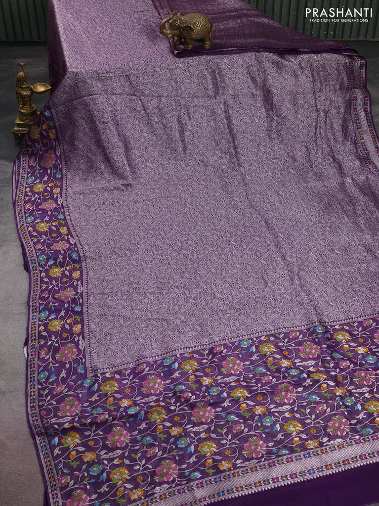 Banarasi semi raw silk saree violet with allover silver zari woven brocade weaves and floral design paithani border
