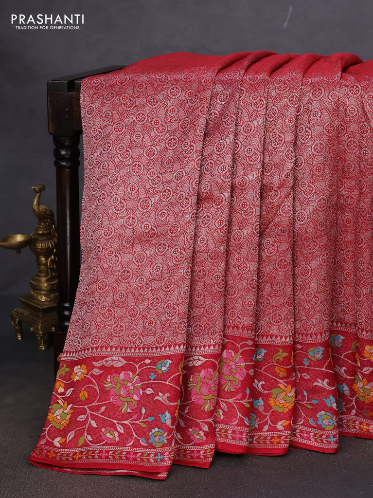 Banarasi semi raw silk saree red with allover zari woven brocade weaves and floral design paithani border