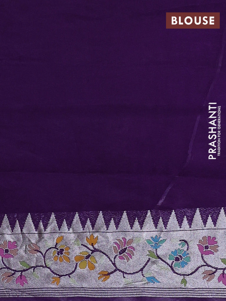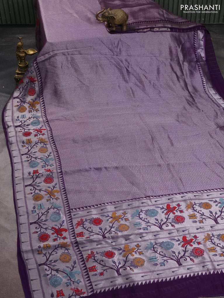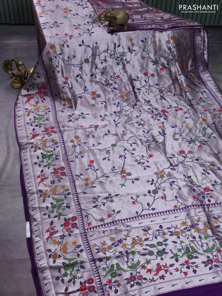 Banarasi semi raw silk saree violet with allover silver zari woven paithani weaves and woven border