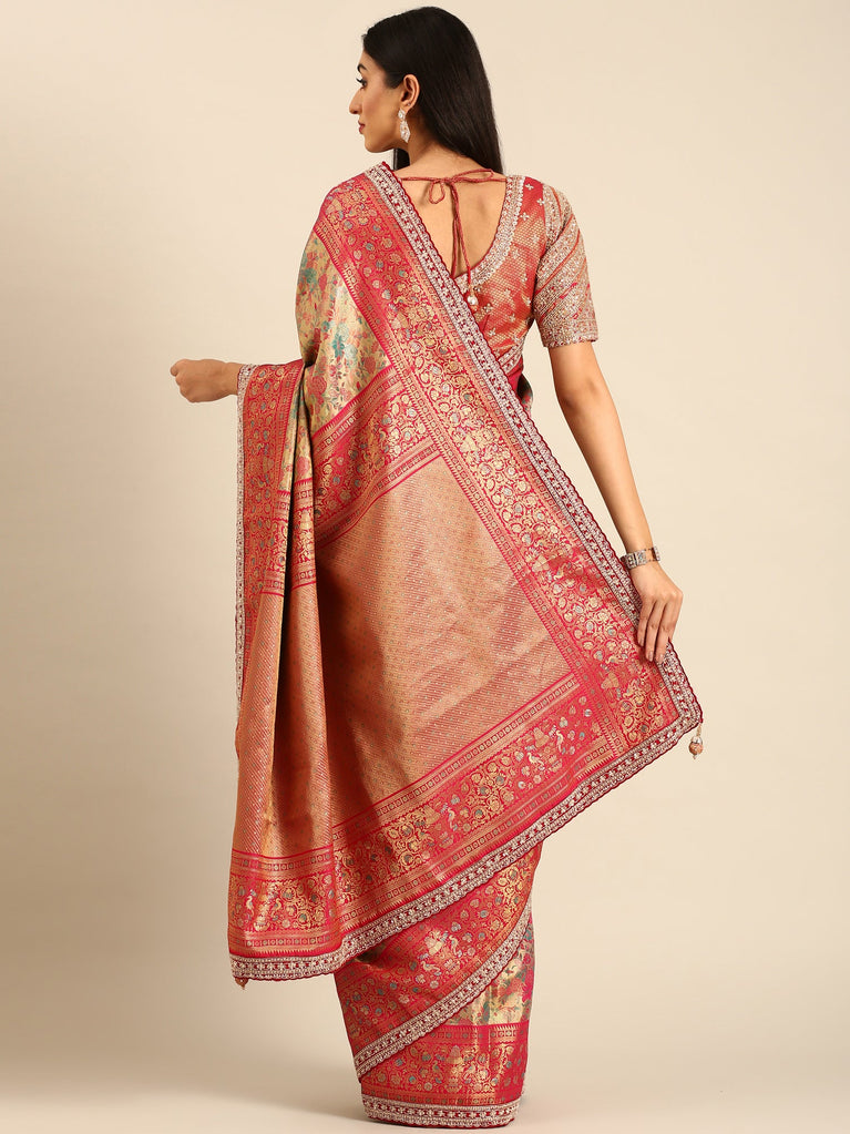 Banarasi Weaving Saree with Heavy Contrast Border & Semi Oxidized Work