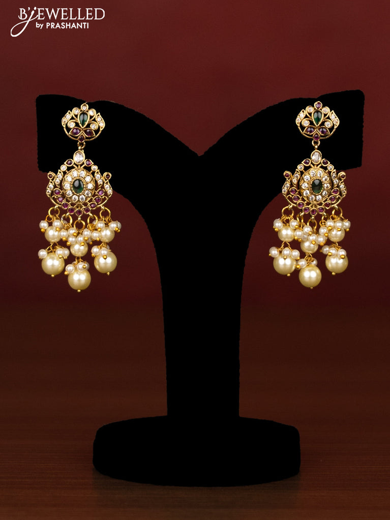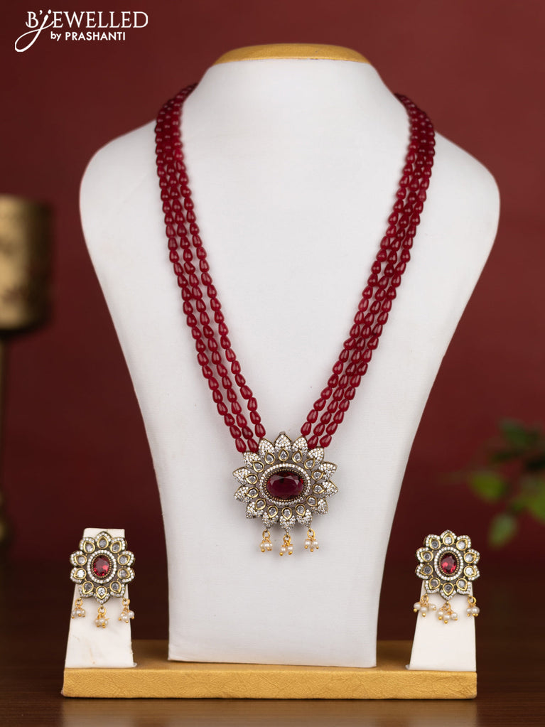 Beaded triple layer maroon necklace with ruby & cz stones and pearl hangings in victotrian finish