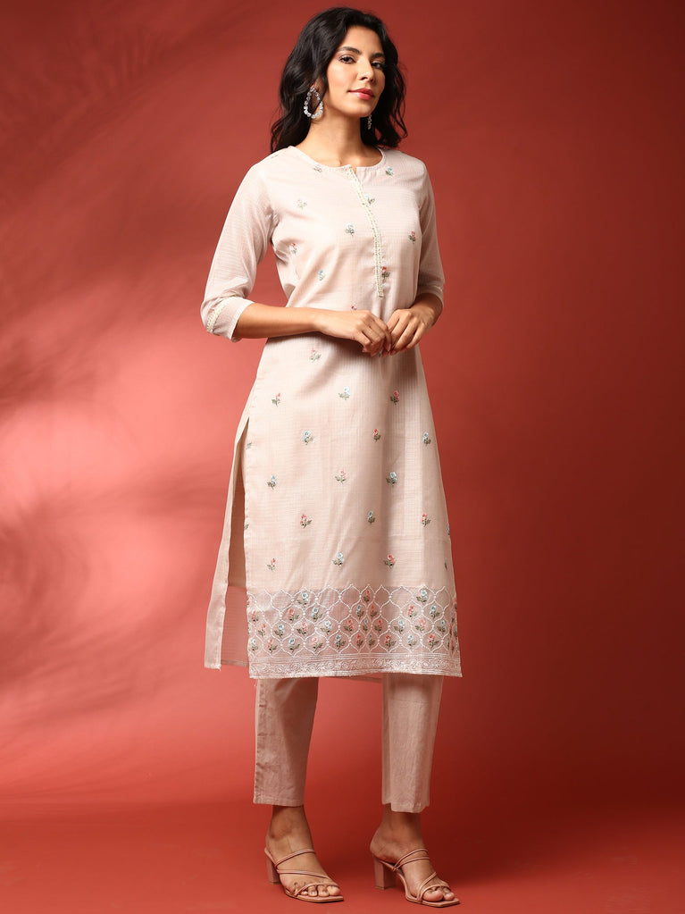 A versatile style essential, this beige straight kurta in cotton opens at the front for effortless layering. Its clean neckline and side slits add ease, while the muted hue makes it a perfect canvas for multiple looks—dress it up with palazzos or down with jeans.