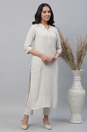 Beige mandarin neck kurta with printed and button placket detail. It is made up of cotton flax.
