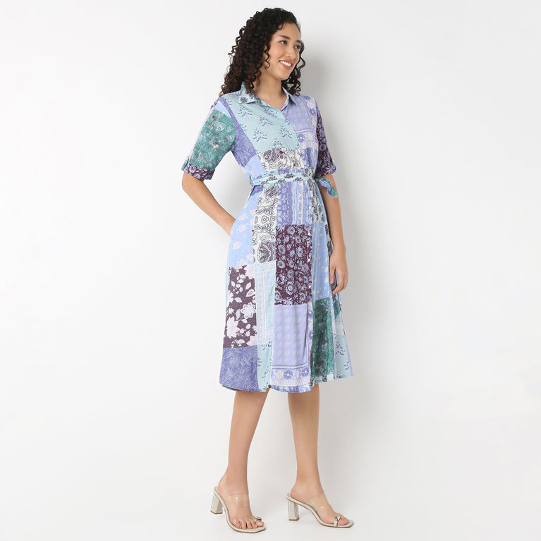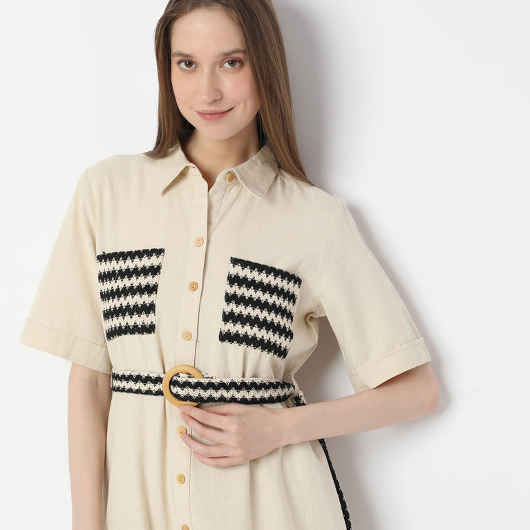 Below Knee Sleeveless Shirt Collar Schiffli Flare Fit Dress
