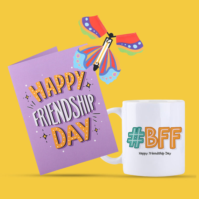 Make your BFF smile with our cutest Friendship Day special duo! This adorable combo includes:Friendship Day Butterfly Card - Best friends don’t deserve sensible gifts. Gifts for them are meant to be silly, weird, and adorably funny. Like this one. This Friendship Day card has a pet butterfly sleeping inside. Once opened, the creature flutters out on its own.BFF Mug - What's a better way to make your best friend forever smile than to surprise them with a BFF special gift!?Wish your BFF a very happy friendship day with our BFF special mug. It’s an ideal gift for all the cozy catch-up sessions with your bestie.