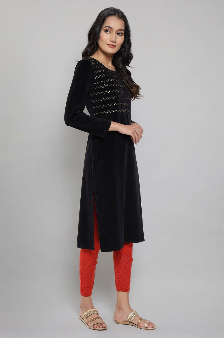 Black Festive Kurta In A Flattering Straight Silhouette With Side Slits. A Round Neckline Adorned With Intricate Jewel Neck Yoke Placement With Foil Print And Sequins Adds A Touch Of Sophistication.