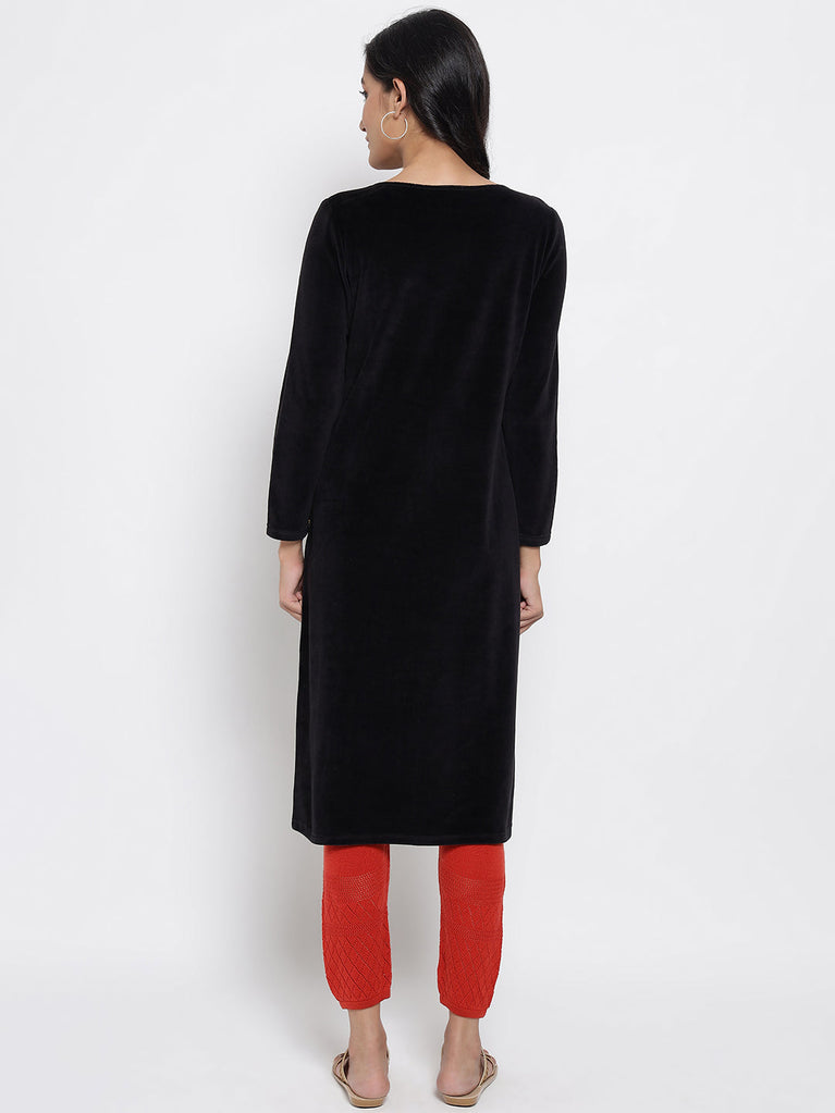 Black Embroidered A-Line Acrylic Winter Kurta