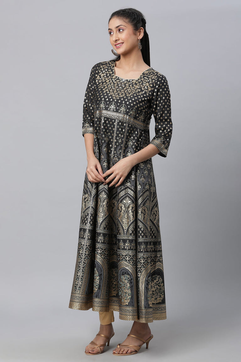 This black and gold-toned mandarin neck 3/4 sleeve kurta has embellished and printed detail, a button with keyhole detail on the front, front slit with asymmetrical hem.