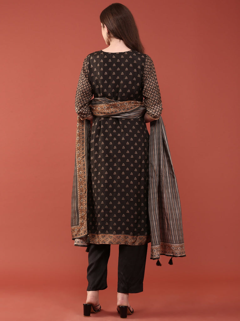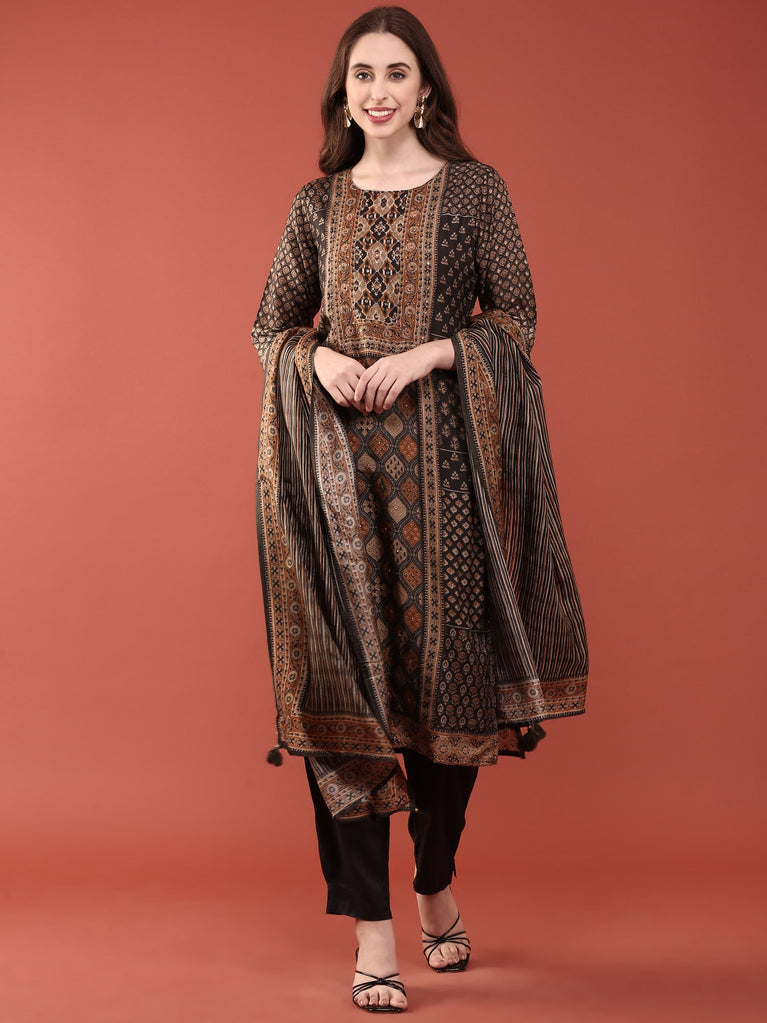 Black Embroidered A-Line Kurta with Straight Pant and Dupatta Set