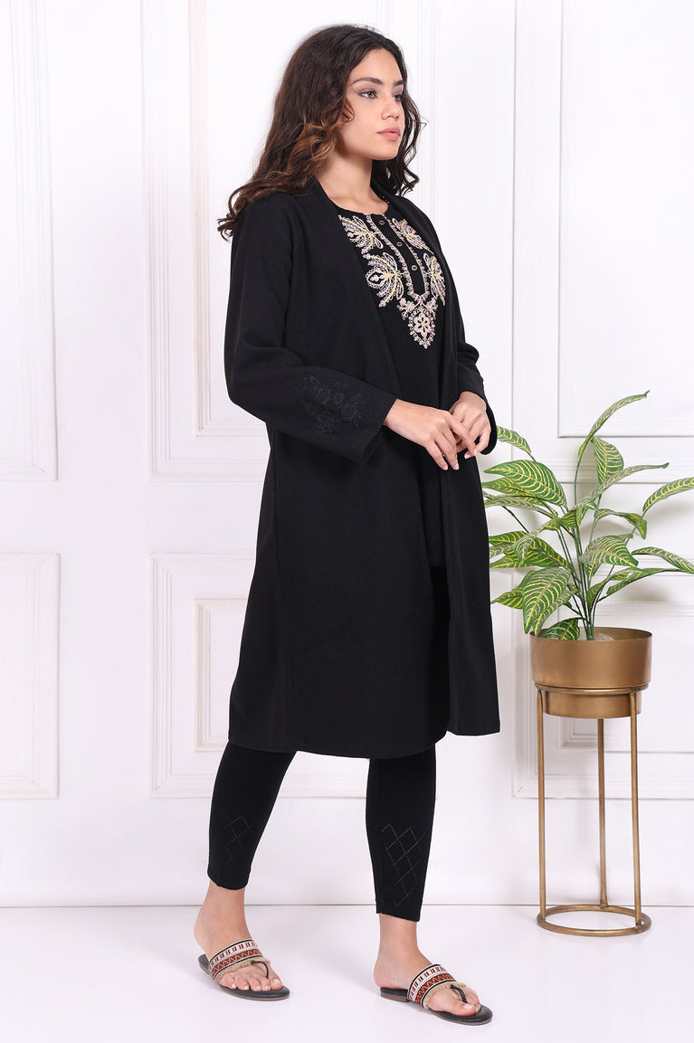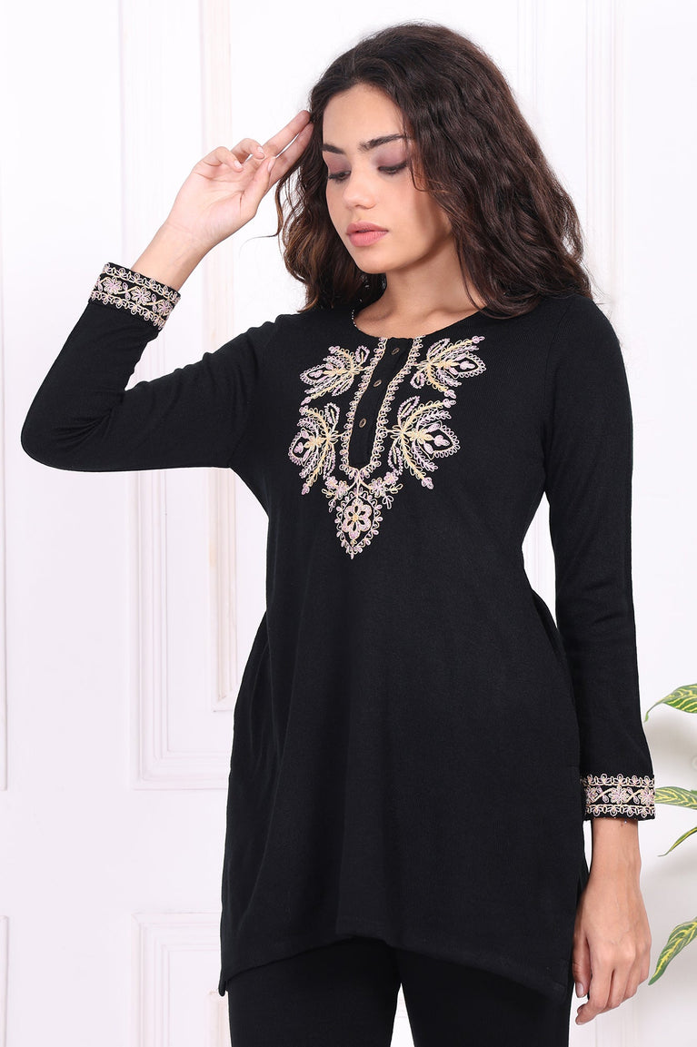 Refined and versatile, this black acrylic tunic for women is a wardrobe essential. Featuring intricate thread embroidery on the neckline and cuffs, this straight silhouette tunic with side slits offers a flattering fit. The soft acrylic fabric ensures comfort and warmth, making it perfect for casual outings or festive gatherings. Elevate your style with this elegant and versatile piece.