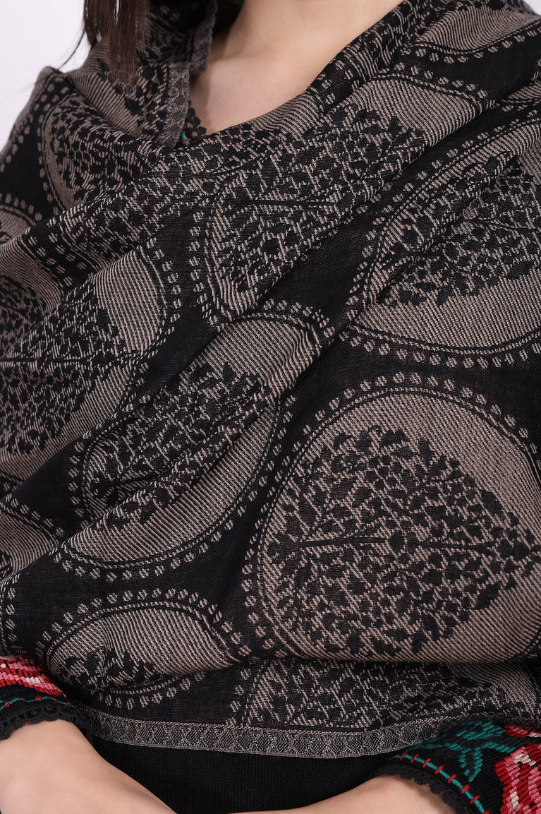 A whisper of heritage for the modern wardrobe, this stunning black shawl for women is a true masterpiece of textile art. Imagine wrapping yourself in its luxurious warmth; it’s crafted from a soft wool blend that feels beautiful against the skin while draping with an elegant, fluid grace that complements any silhouette. This designer stole is generously sized at 2 meters in length and 70 centimeters in width, offering versatile styling options and graceful, opaque coverage. Its real soul, however, is woven into the magnificent borders. Here, an intricate, yarn-dyed paisley and floral jaal design unfolds in a symphony of rich crimson, deep emerald, and muted gold tones, creating a vibrant contrast against the classic black field. This ethnic wrap showcases exceptional woven artistry, with a subtle sheen in its threads that suggests delicate Zari work, catching the light with every movement. The shawl is completed with classic, soft fringes that add a touch of traditional charm. It’s the perfect companion for festive soirées, formal dinners, or a winter wedding celebration. More than just an accessory, it's a statement of timeless style and exquisite craftsmanship you’ll reach for again and again.