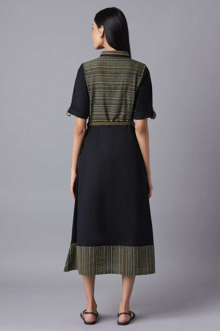 Make the statement in this classic black coloured flared dress by Aurelia. Crafted in cotton, the dress has shirt collar with button placket and geometric print.