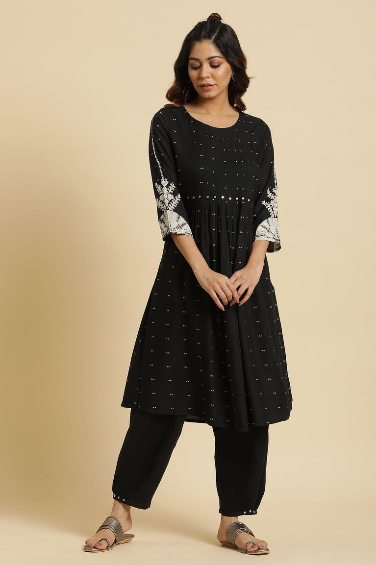 Elevate your ethnic wardrobe with this sophisticated black kurta. Made from 100% viscose, this woven garment offers exceptional comfort and breathability, perfect for casual wear. The straight silhouette flatters various body types, while the embroidered details add a touch of elegance to the overall design. The three-quarter sleeves provide versatility, making it suitable for different seasons and occasions. The round neckline complements the kurta's sleek appearance, creating a balanced and stylish look. Crafted specifically for women who appreciate ethnic fashion with a modern twist, this kurta is a versatile addition to any wardrobe. The rayon fabric ensures a soft, flowing drape that moves gracefully with every step.