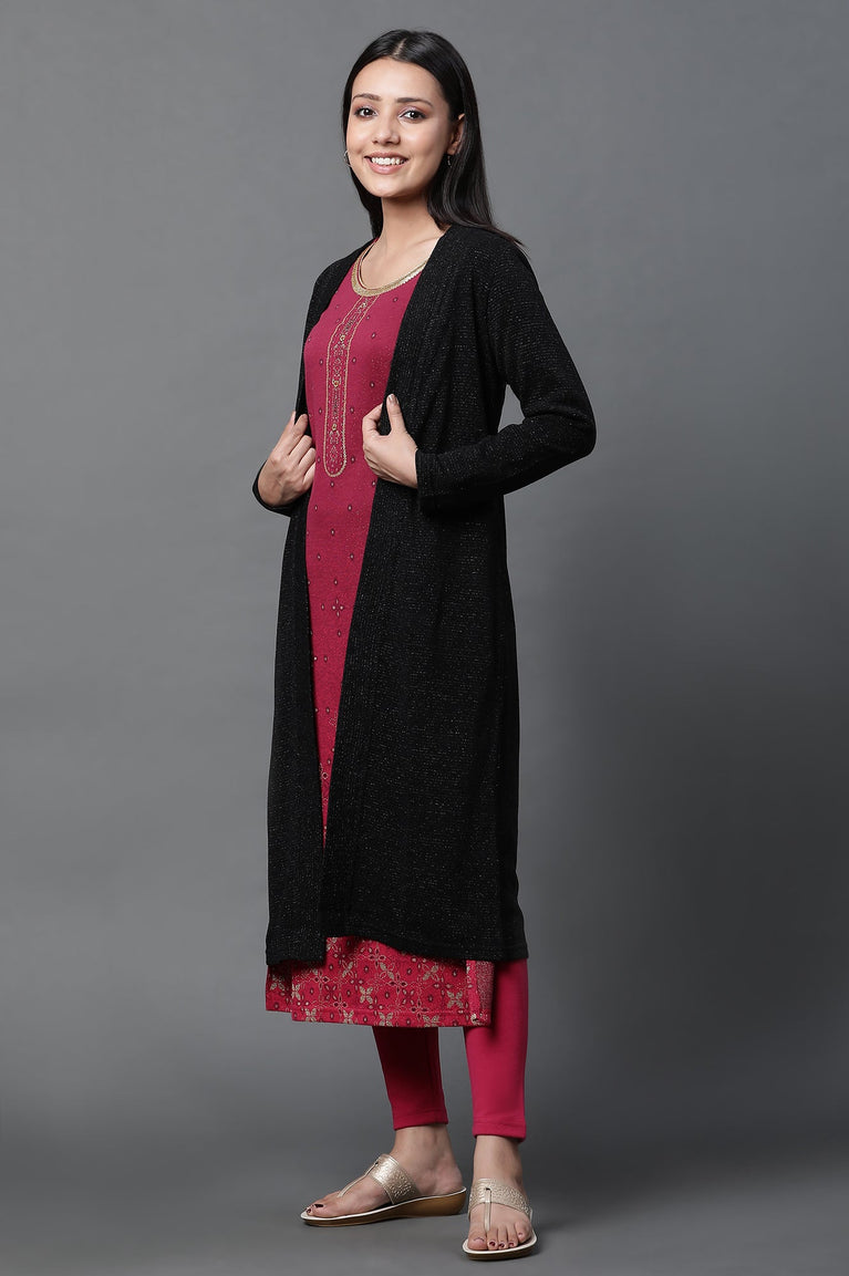 Made With Premium Soft Touch Acrylic, This Knit Cardigan Has Open Front And Features Floral Print On Border For Contrasting Details. It Has Printed Full Sleeves And Long Length, Which Gives A Chic Look.
