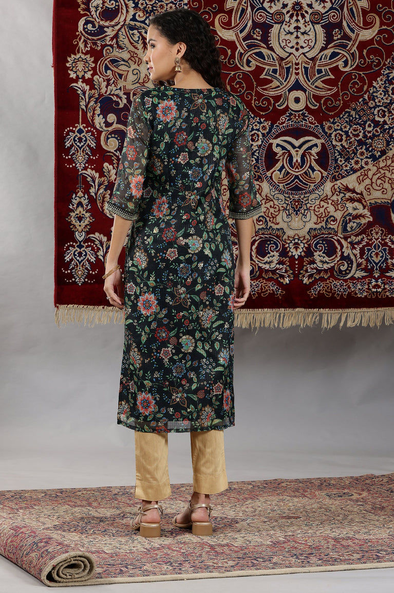 Black Floral Printed Straight Kota Kurta with Embroidered Neckline