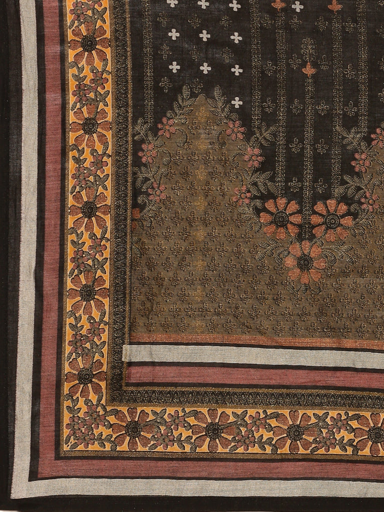 Black Floral Thread Embroidery Straight Woven Kurta with Flared Pant and Dupatta Set