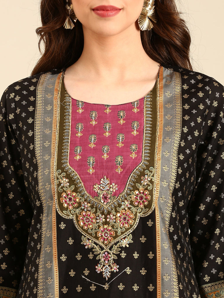 Black Foil Printed Embellished Straight Kurta, Pleated Palazzo and Dupatta Set