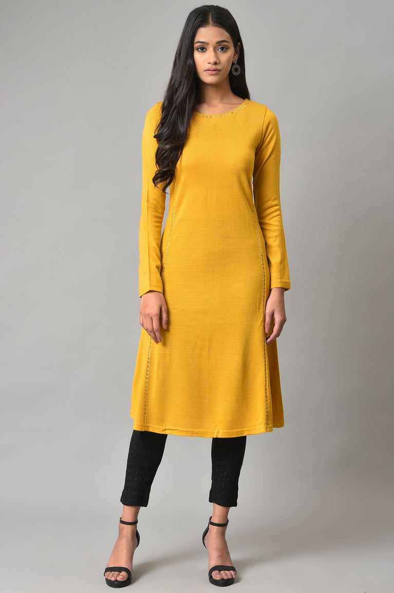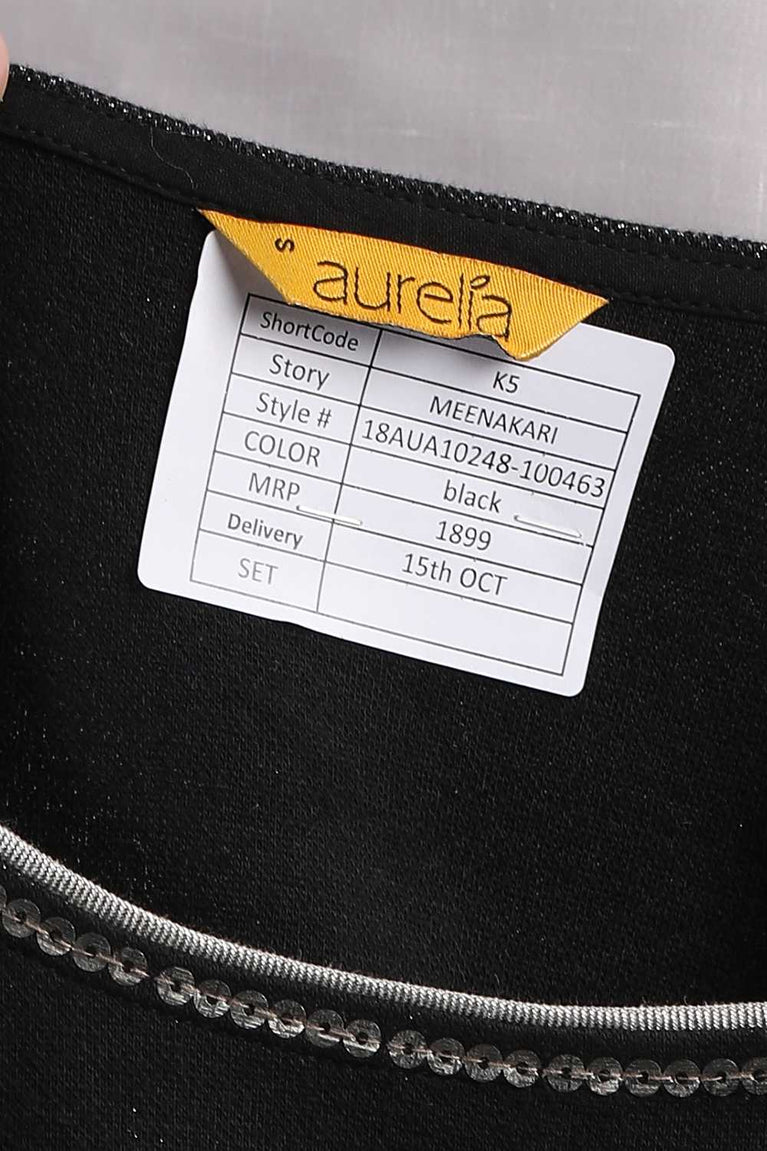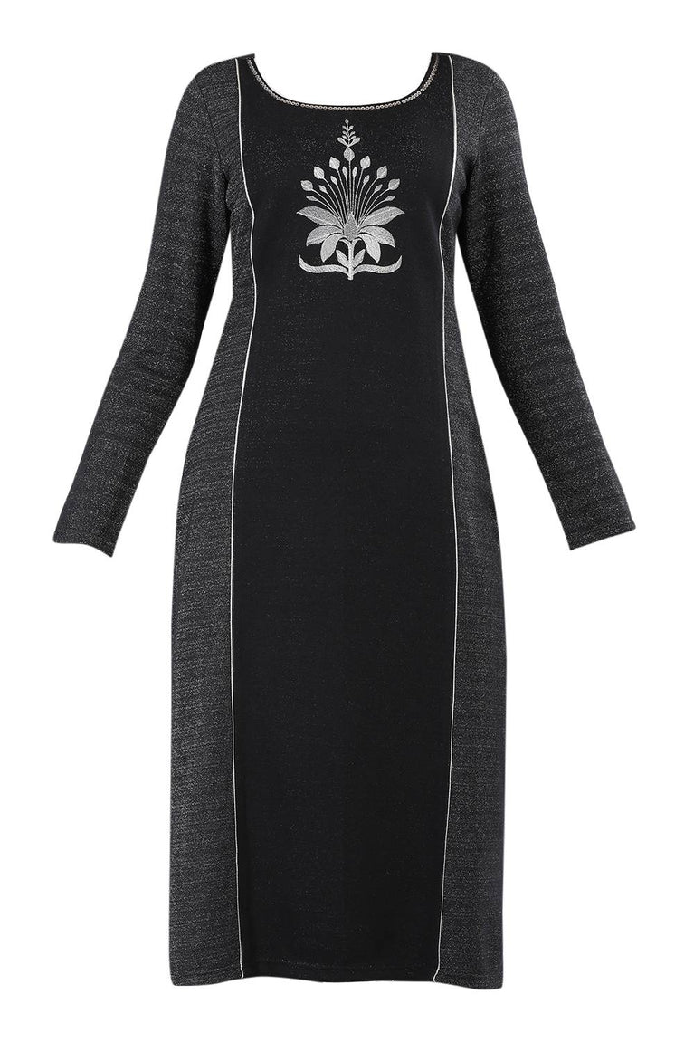 The Jet Black Knitted Circular Flared Dress Enhanced With Delicate Sequins Embellishment At Sleeves. It Has The Band Collar With A Slit Opening At Back With A Button Closure .